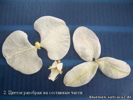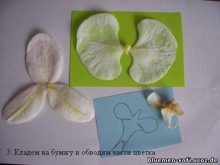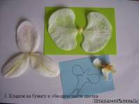 Выкройки цветов делаются из живых цветов – это самый лучший вариант, т.к. они точные и правильные. Это очень просто (посмотрите на картинки): Для начала нужно взять живой цветок. Разобрать его на лепестки или составные части. Положить на бумагу, обвести, надписать что это и сколько лепестков надо. Ваши выкройки готовы. Кройка лепестковПо готовым выкройкам лепестки выкраивают из материала. Выкройки кладут так, чтобы основная ось лепестка шла по косой нитке - то есть косо по отношению к долевой и поперечной нитям ткани. Делается это для того, чтобы лепесток лучше принимал нужную форму, лучше вытягивался, а края меньше махрились.